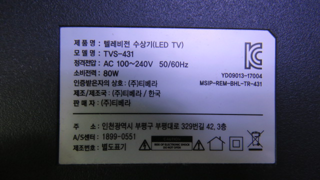제품정보=TVstar TVS-431(주)티베라-43인치 LED-TV
